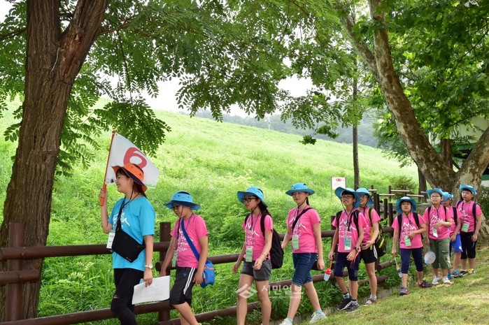 최근 경기 수원시의 자연자원과 역사적 명소를 발견하는 '청소년 자연생태 대탐사' 출정식이 광교공원에서 열린 가운데 참여 청소년들이 1박2일간 생태체험을 진행하고자 공원을 걸어가고 있다.(사진제공=수원시청)
