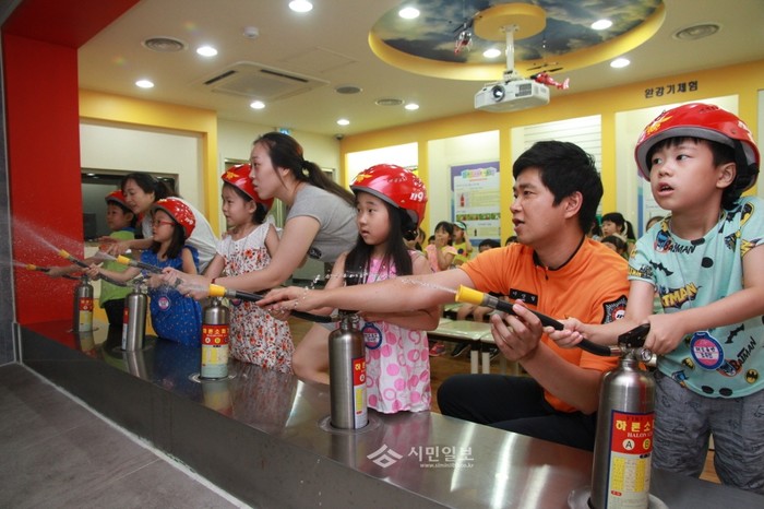 서울 구로소방서가 최근 동산유치원 원생 및 지도교사를 본서 3층에 마련된 소방안전체험교실로 초청해 '나는야 꼬꼬마 소방대장' 체험학습 프로그램을 운영한 가운데 참여 어린이들이 소방대원의 교육에 따라 물소화기 체험을 하고 있다.(사진제공=구로소방서)
