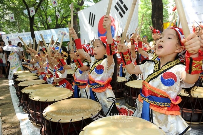 70주년 광복절을 맞아 지난 12일 오전 송파구 가락삼익맨숀 아파트에서 '광복절 주민화합행사'가 열린 가운데 어린이들이 난타 공연을 하고 있다.(사진제공=송파구청)