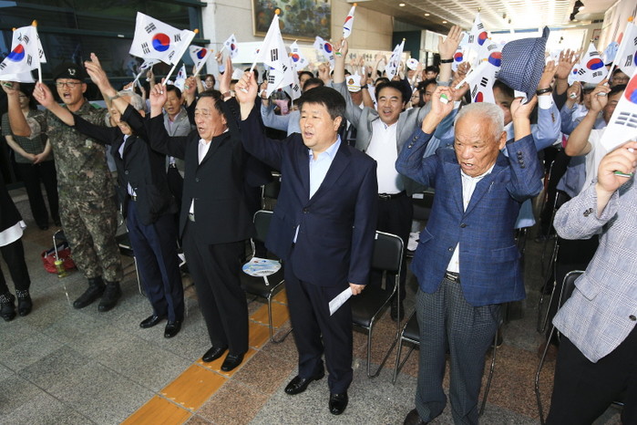 인천 계양구가 최근 광복 70주년을 맞아 구청 1층 아트갤러리에서 '2015 태극기 전시회'를 진행한 가운데 전시회장을 찾은 박형우 구청장(앞줄 가운데)과 참여 시민들이 태극기를 들고 만세를 외치고 있다.(사진제공=계양구청)