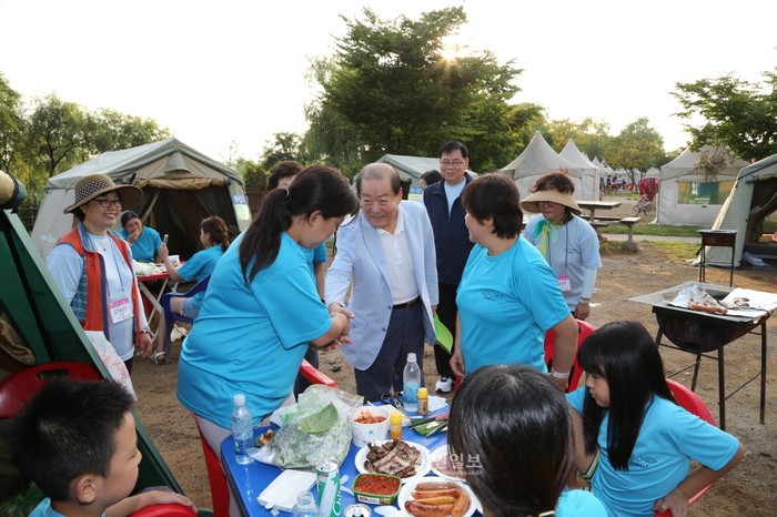 박홍섭 마포구청장(가운데)이 1박2일 일정으로 최근 상암동 난지캠핑장 일대에서 열린 '3대 가족캠프'를 방문해 참여가족들과 인사를 나누고 있다. 이번 가족캠프는 세대간 격차를 줄이고, 가족의 소중함을 느끼게 하는 시간을 마련하고자 기획된 행사다. (사진제공=마포구청)