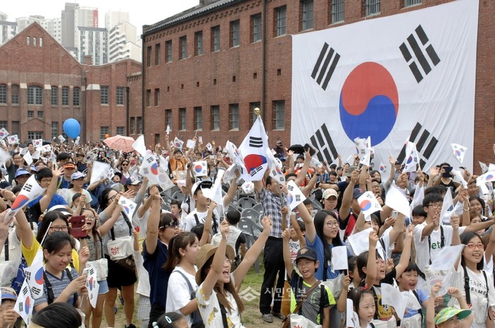 지난 15일 서대문구가 주최한 '2015 서대문독립민주축제' 행사의 일환으로 시민참여 역사 연극 '아리랑 랩소디'가 서대문형무소역사관에서 펼쳐진 가운데 참가시민과 어린이들이 태극기를 흔들며 환호하고 있다. (사진제공=서대문구청)