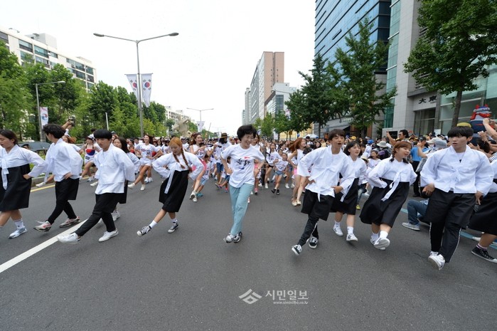 지난 15일 광복절을 맞아 송파구청 사거리~올림픽공원 '평화의 문' 광장의 차량을 통제하고 진행한 ‘춤815’ 플래시몹 행사에 참석한 박춘희 구청장(가운데)이 시민들과 함께 ‘독립군 애국가’에 맞춰 흥겹게 춤을 추고 있다. (사진제공=송파구청)
