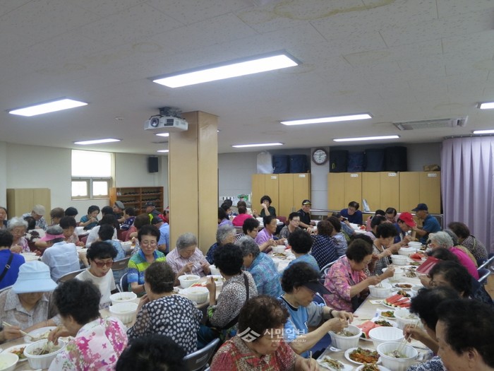 서울 성북구 정릉2동 이웃사랑봉사회가 최근 기력이 떨어지기 쉬운 무더위를 맞아 노인들의 원기회복을 돕고 함께 무더위를 이겨내고자 지역노인 120여명을 초청해 삼계탕을 대접한 가운데 노인들이 삼계탕을 먹고 있다. (사진제공=성북구청)