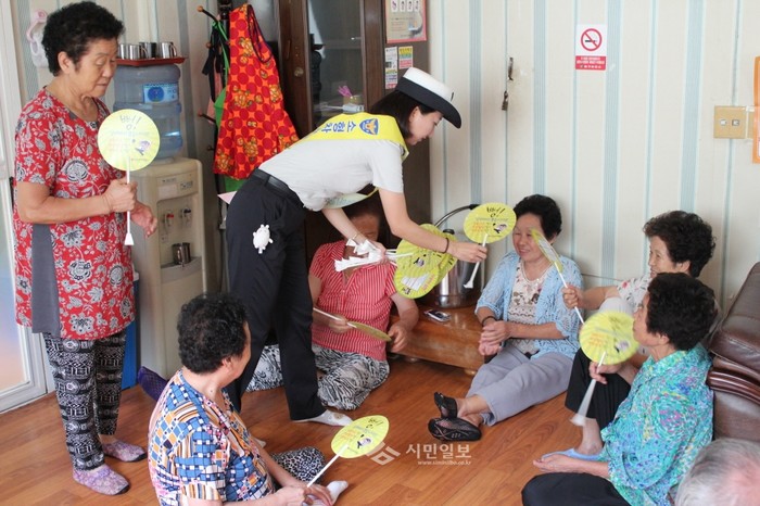 인천 중부경찰서는 17일 지역내 동일경로당 등 4곳을 방문해 노인들에게 안전한 보행 방법을 홍보하고 교통사고를 예방하고자 '찾아가는 노인 교통안전 캠페인'을 실시했다. 사진은 이날 한 경찰이 경로당에서 노인들에게 홍보 문구가 담긴 부채를 나눠주고 있는 모습.(사진제공=중부경찰서)