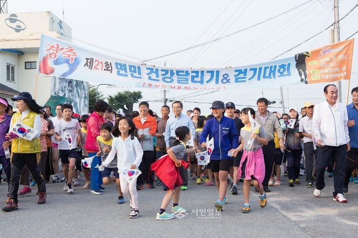 경북 구미시 무을면은 최근 남유진 구미시장을 비롯한 주민 500여명이 참여한 가운데 '제21회 무을면민 건강달리기 대회'를 개최했다. 사진은 이날 걷기대회에 참여한 남 시장(뒷줄 가운데)과 주민들이 달리기와 걷기를 시작하고 있는 모습.(사진제공=구미시청)