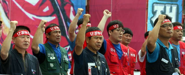 금호타이어 노동조합이 3년만에 전면파업에 돌입한 17일 오전 광주 광산구 금호타이어 공장 파업광장에서 임금피크제와 관련 없는 성과금 지급 등을 요구하는 기자회견을 열고 있다.