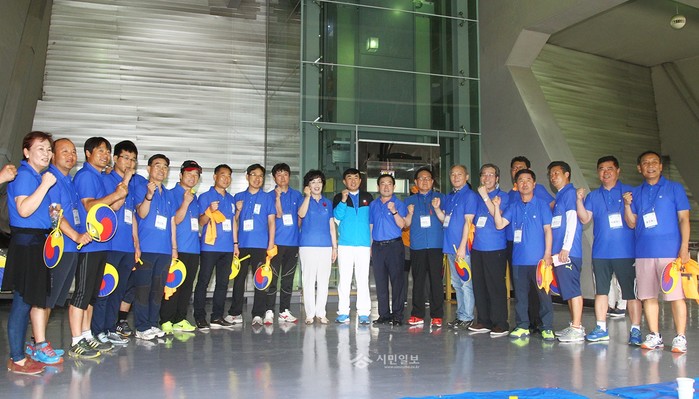 서울 송파구의회 임춘대 의장(가운데)이 지난 16일 잠실실내체육관에서 열린 ‘2015 서울시민 생활체육대회’ 개회식 행사에 선수단을 격려하고자 참석해 선수단과 함께 파이팅을 외치고 있다.(사진제공=송파구의회)