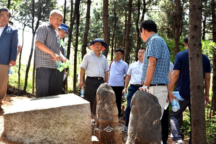노원구가 지난 17일 오전 11시 월계동 비석골근린공원 주변 일대에서 전문가 초청 '초안산분묘군 현장 방문'을 실시한 가운데 김성환 구청장(가운데)이 문화재 관련 전문가들과 함께 월계동 비석골근린공원 주변 사적 제440호 초안산분묘군 문화재구역을 현장 답사하고 보수, 정비 방안에 대한 의견을 나누고 있다.(사진제공=노원구청)