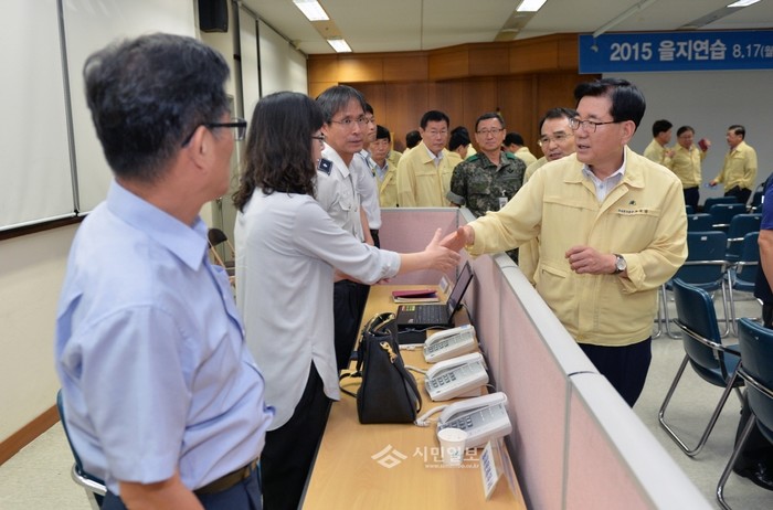 유덕열 동대문구청장(오른쪽)이 '2015 을지연습'이 시작된 지난 17일 오전 10시 구청 지하2층 종합상황실을 찾아 을지연습 참가자들과 악수하며 격려의 말을 전하고 있다.(사진제공=동대문구청)