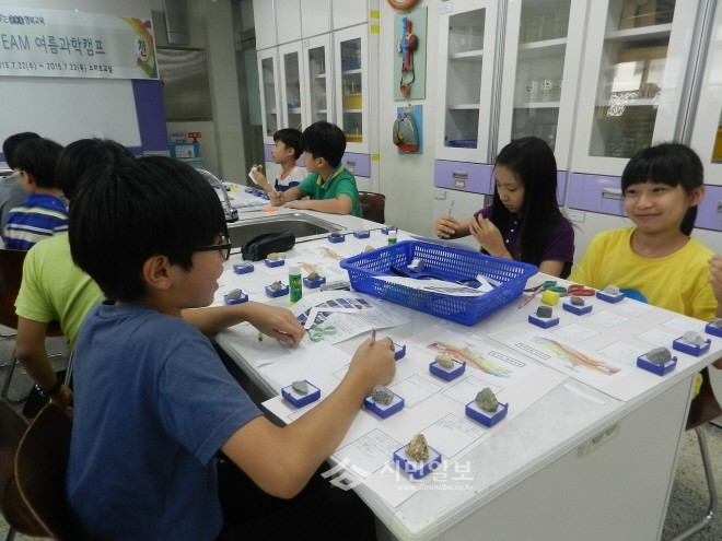 경기 부천시 석천초등학교가 최근 여름방학 기간을 맞아 '초록빛 꿈돋움 여름학교'를 운영한 가운데 여름학교의 과학캠프에 참여한 학생들이 암석의 생성위치를 배우는 체험학습을 하고 있다.(사진제공=부천교육지원청)