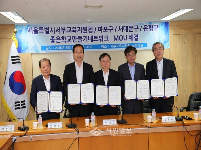 지난 17일 박홍섭 서울 마포구청장(맨 왼쪽)이 서울 서대문구 대현동 소재 서부교육지원청 소회의실에서 열린 '서부교육지원청-마포구-서대문구-은평구가 함께 좋은학교만들기 네트워크 업무협약 체결식'에 참석해 기념촬영을 하고 있다. (사진제공=마포구청)