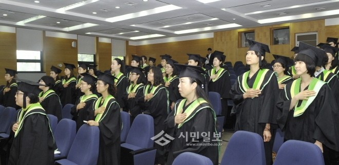 | ▲ '연세-서대문 열린시민대학 수료식'에 참석한 수료생들이 국기에 대한 경례를 올리고 있다. | ||