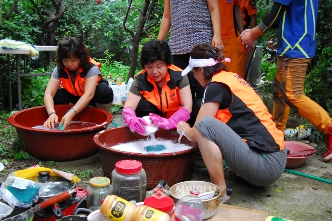 경기 하남소방서가 최근 지역내 취약계층 3가구에 대한 '화재예방 주거환경 개선사업'을 실시한 가운데 참여 봉사자들이 해당 가구의 식기를 세척하고 있다.(사진제공=하남소방서)
