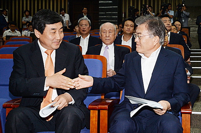 20일 오전 서울 여의도 국회에서 열린 새정치민주연합 당무위원회의에서 문재인 대표가 이종걸 원내대표에게 악수를 청하고 있다.