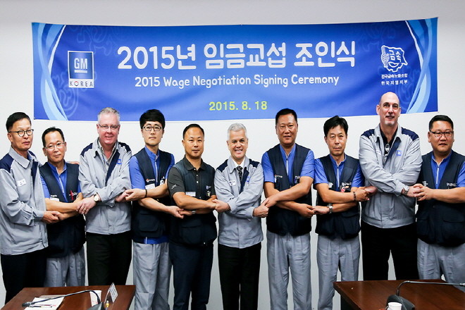 이날 조인식에는 세르지오 호샤(Sergio Rocha) 한국지엠 사장과 강두순 전국금속노동조합 부위원장, 정종환 전국금속노동조합 한국지엠 지부장 등 노사 교섭대표가 참여, 합의서에 서명했다.