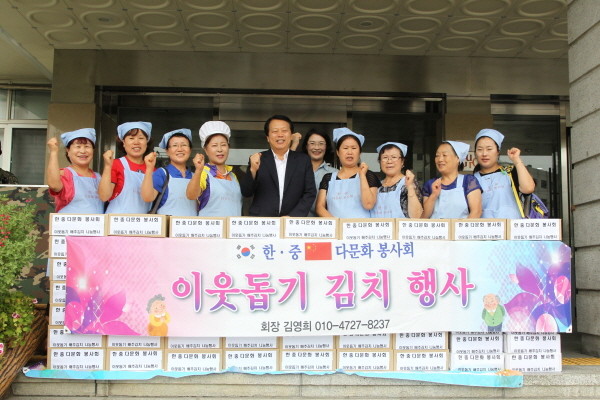 최근 서울 구로구청 중앙현관에서 한·중다문화봉사회가 지원 다문화 가족과 다문화 단체를 위해 김치 5kg짜리 120상자(180만원 상당)를 기부하고 이성 구청장(가운데)과 기념촬영을 하고 있다.(사진제공=구로구청)