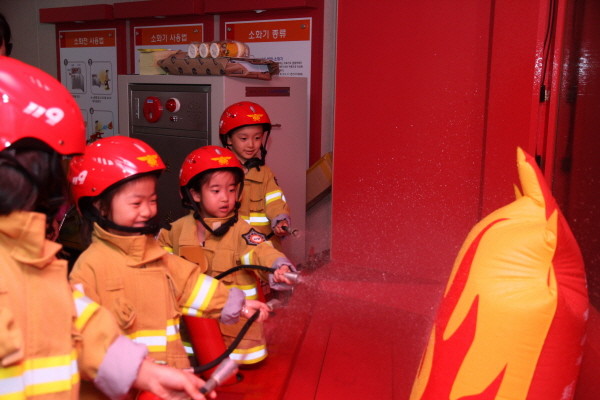 서울 동작소방서는 최근 소방서 3층 소방안전체험교실에서 동심어린이집 어린이 40명을 대상으로 소방안전교실을 실시했다. 사진은 어린이들이 물 소화기를 발사하며 소화기 체험을 하고 있는 모습.(사진제공=동작소방서)