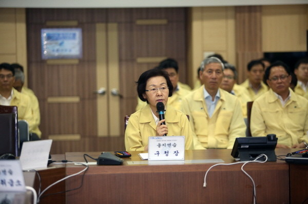 최근 강남구청 본관 지하 1층 을지연습 종합상황실에서 열린 ‘을지연습 강평회’에 참석한 신연희 구청장이 을지연습 실시 결과를 보고받고 보완·발전시켜야 할 사항 등에 대해 말하고 있다.(사진제공=강남구청)