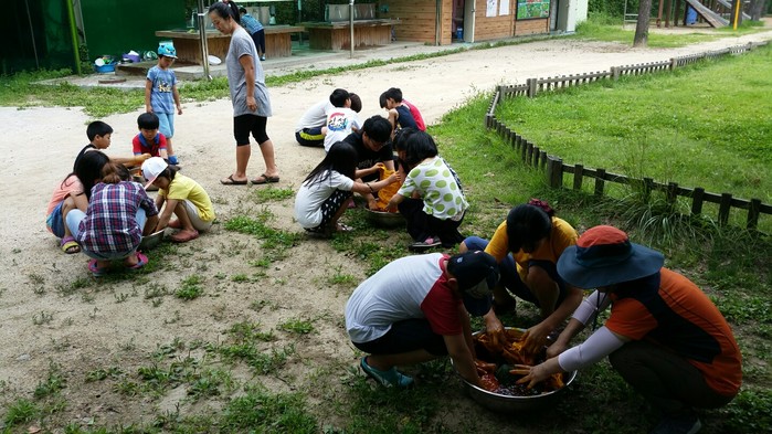 | ▲ 은평교육복지센터가 운영하는 에코캠프에 참가한 학생들이 치자를 이용한 천연염색 체험을 하고 있다. | ||