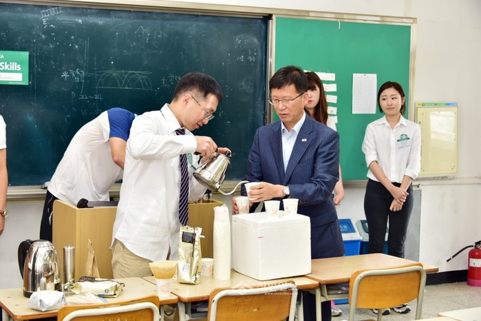 경기 김포시 제일공업고등학교가 최근 JA KOREA·스타벅스 후원으로 3학년 학생들을 대상으로 '진로 교육'을 실시한 가운데 유영록 시장(오른쪽)이 학생과 함께 커피를 내리는 실습을 하고 있다.(사진제공=김포시청)