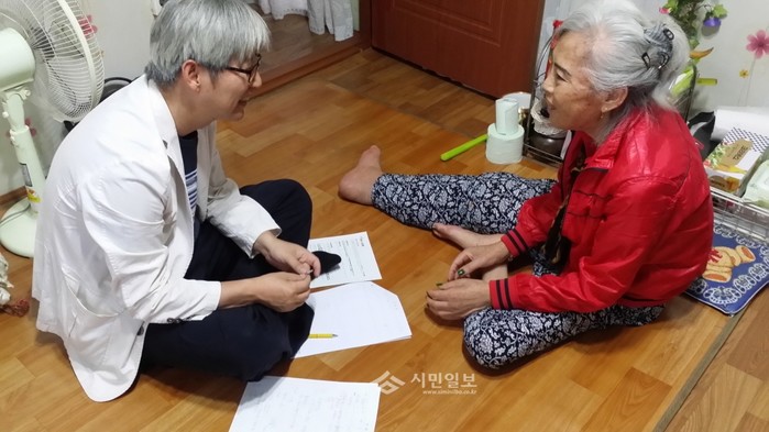 지난 24일 경기 동두천시 중앙동 주민센터가 경희이담한의원과 함께 지역내 거동불편 노인들을 대상으로 실시하는 ‘침술의료봉사’에 참석한 김진성 원장(왼쪽)이 한 홀몸노인의 건강상태를 점검하고 있다.(사진제공=동두천시청)