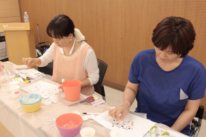 경기 의정부시 어린이급식관리지원센터가 최근 평생교육비전센터 3층에서 어린이집·유치원 교사를 대상으로 '영·유아에게 적용할 수 있는 식품첨가물 창의과학 놀이 교육법'을 주제로 '집합교육'을 실시한 가운데 참여 교사들이 산염기를 이용해 그림을 그리고 있다.(사진제공=의정부시청)