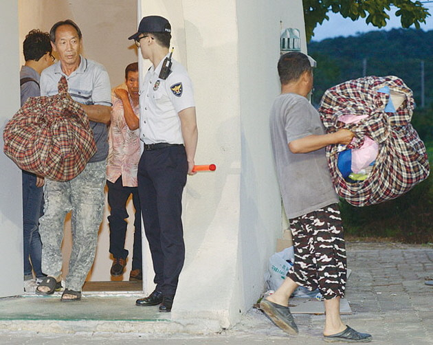 남북 고위급 접촉이 나흘 만에 극적으로 타결된 25일 새벽 경기도 연천군 중면 삼곶리 민방공대피소에 머무르고 있던 주민들이 자신들의 짐을 들고 대피소를 퇴소하고 있다.