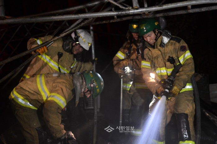 강남소방서가 지난 25일 구룡마을 7B지구에서 원인미상으로 발생한 화재를 진압하기 위해 출동한 가운데 소방대원들이 진화정리 작업을 진행하고 있다.(사진제공=강남소방서)