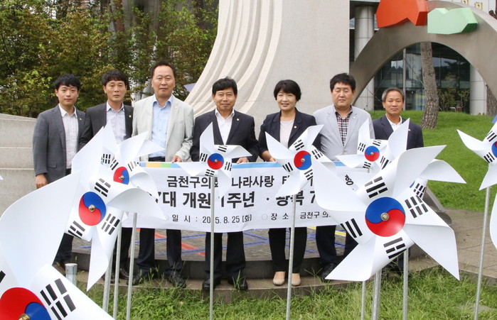바람개비 태극기 동산 조성을 제안한 이경옥 의원은 "금천구의회 청사는 구청, 보건소와 함께 통합 청사를 이루고 있어 규모가 크기 때문에 방문하는 주민들이 부담을 느끼는 경우가 있다"며 "주민들에게 친근하면서도 역동적인 의회 이미지를 줄 방법을 고민하다 올해가 광복 70주년인 점에 착안해 태극기 동산을 생각하게 됐다"고 밝혔다.