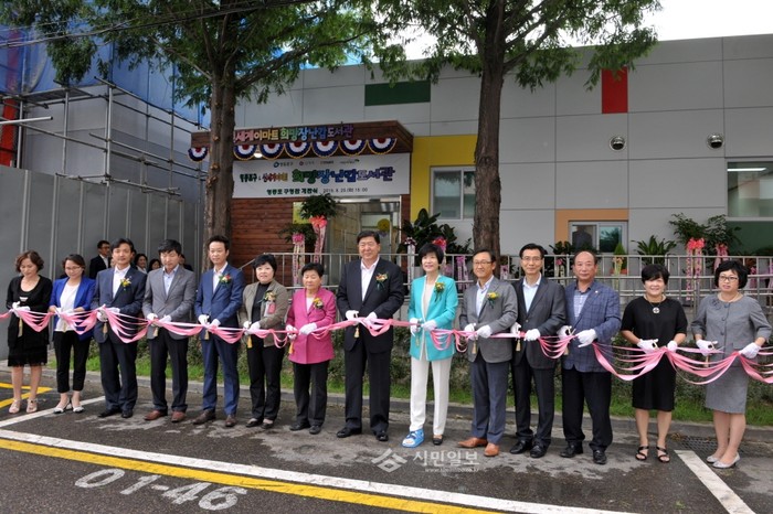 박정자 서울 영등포구의회 의장(왼쪽에서 일곱 번째)이 지난 25일 영등포구청 별관 청사에 문을 연 희망장난감도서관의 개관식에 참석해 참석 내빈들과 함께 테이프 커팅식을 진행하고 있다.(사진제공=영등포구의회)