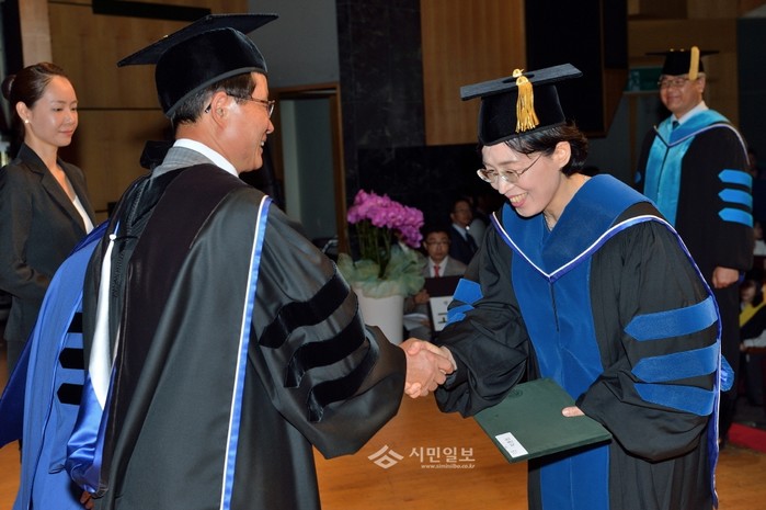 '시민의 자원봉사 활동에 영향을 미치는 요인에 관한 연구'란 주제의 학위논문을 발표한 박춘희 송파구청장(오른쪽)이 최근 건국대 새천년관에서 열린 ‘2015 박사학위 수여식’에서 행정학박사 학위를 수여받고 있다.(사진제공=송파구청)