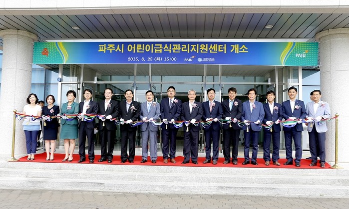 경기 파주시와 식품의약품안전처가 주관해 위탁 운영하고 있는 ‘파주시 어린이급식관리지원센터’ 개소식이 지난 25일 서영대학교 파주캠퍼스 서영홀에서 열려 이재홍 파주시장(오른쪽에서 일곱 번째)과 내빈들이 개소식을 열고 있다.(사진제공=파주시청)