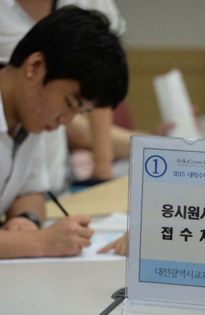 2015학년도 대학수학능력시험의 수능 원서접수를 25일부터 9월 12일까지 일선 고등학교와 전국의 85개 시험지구교육청에서 접수하는 가운데 원서접수 첫날인 25일 오전 대전시교육청에서 학생이 서류를 작성하고 있다.