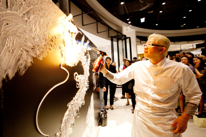 | ▲ 쓰지구치 쉐프가 머랭으로 그린 용을 휴대용 가스토치를 이용한 그을림으로 색을 입히고 있다. | ||