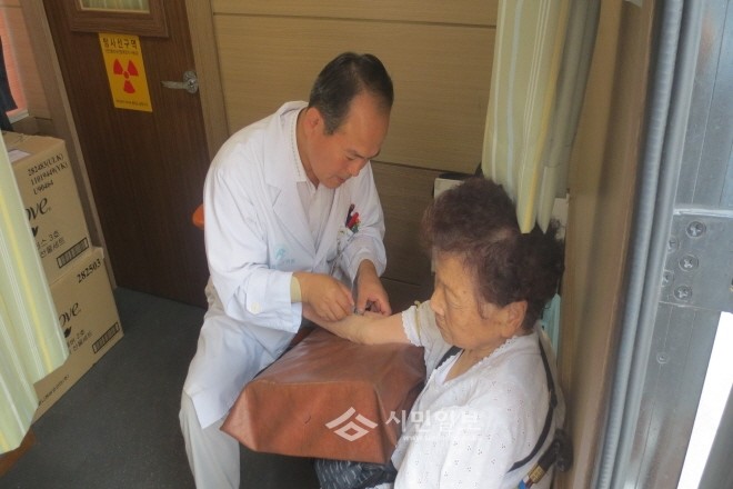 서울 성북구 보문동마을복지센터는 최근 아산복지재단이 운영하는 무료 순회 진료(버스)봉사단과 연계해 의료소외계층 50명을 대상으로 '의료연계봉사 행사'를 열었다. 사진은 버스 안에서 진료를 받는 주민의 모습.(사진제공=성북구청)