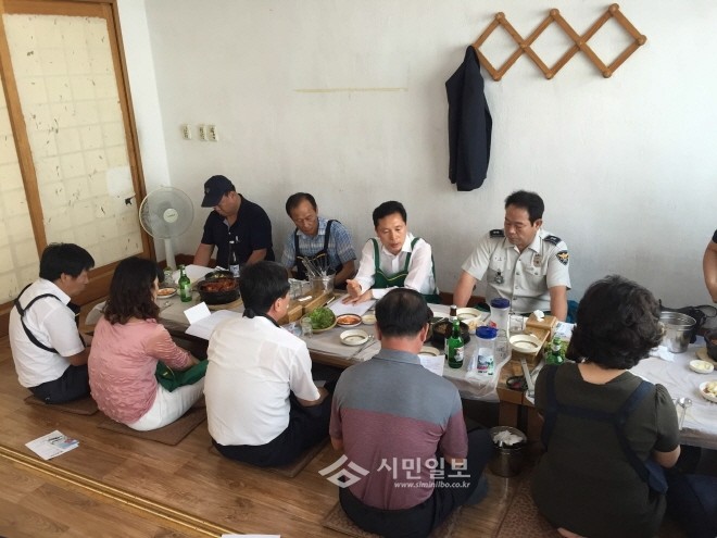 경북 구미 도량동사무소가 지난 27일 낮 12시 지역내 식당에서 도량동단체장협의회 주관으로 버스 노선 개편 홍보를 위한 간담회를 개최해(윗줄 오른쪽부터) 강흥구 도량지구대장, 최현도 동장, 단체장 등 10명이 대화를 나누고 있다.(사진제공=구미시청)