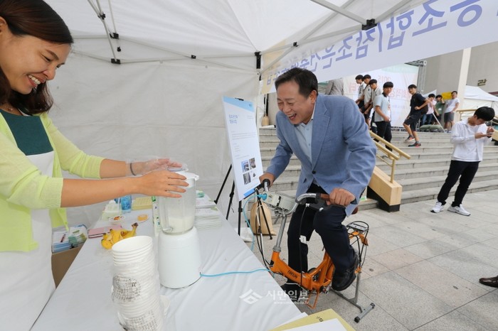 금천구는 최근 독산고등학교에서 '2015 사회적경제 학교 장터'를 개최했다. 사진은 행사에 참여한 차성수 구청장이 '자전거 발전기'로 주스를 만들고 있는 모습(사진제공=금천구청)