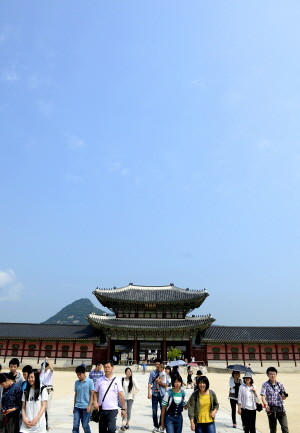 청명한 가을날씨를 보인 31일 오전 서울 종로구 광화문에서 파란 하늘 아래 관광객들의 발길이 이어지고 있다./뉴시스