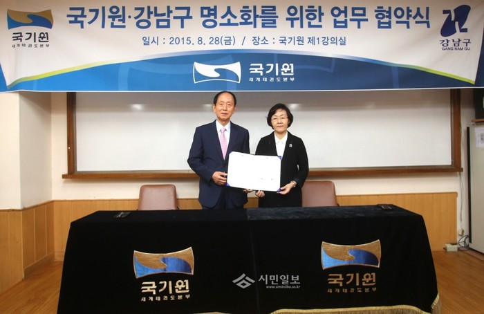 신연희 서울 강남구청장(오른쪽)이 최근 강남구 국기원에서 정만순 국기원장과 국기원이 명소로 거듭날 수 있도록 국내외 마케팅을 돕고 관광객 유치를 위한 지원을 위해 ‘국기원 명소화를 위한 업무협약’을 체결하고 기념촬영하고 있다.(사진제공=강남구청)