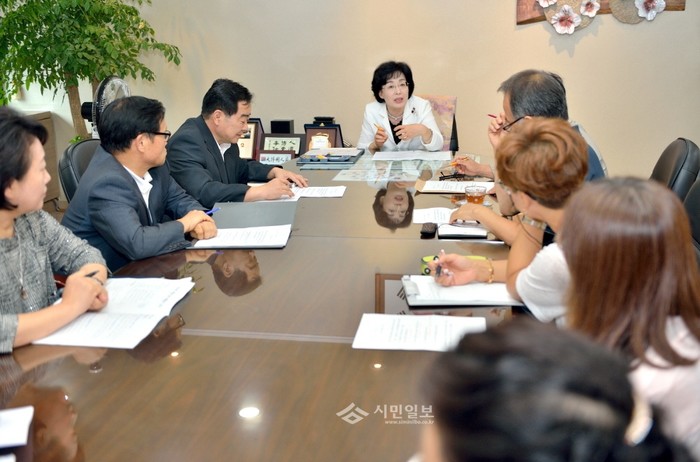 지난 26일 박춘희 서울 송파구청장이 구청장실에서 매월 2회씩 정기적으로 민원인과의 소통을 위해 개최하는 ‘구청장과의 금요민원데이트’에 참석해 주민들의 민원사항에 대해 토론하고 있다.(사진제공=송파구청)