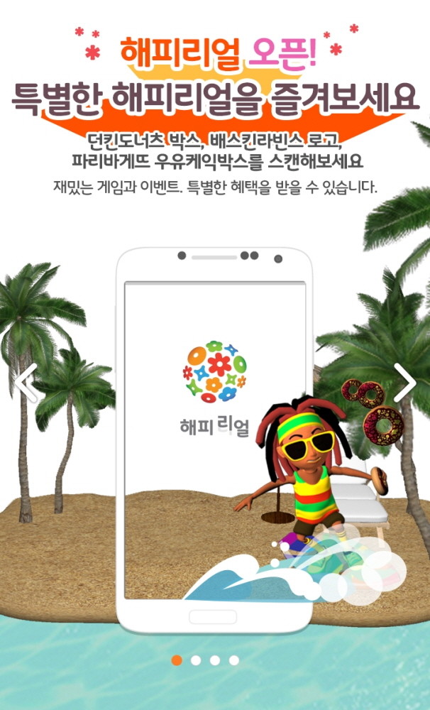 먼저, 던킨도너츠에서 도넛 구매 시 제공하는 ‘자메이카 도넛 박스’의 앞면 이미지를 해피리얼 앱으로 인식하면, 서핑보드를 타고 도너츠를 먹는 게임을 즐길 수 있다. 게임 스코어에 따라 1등 100만 포인트부터 5등 1000포인트까지 총 650만 포인트의 해피포인트를 제공하는 이벤트도 함께 진행한다.