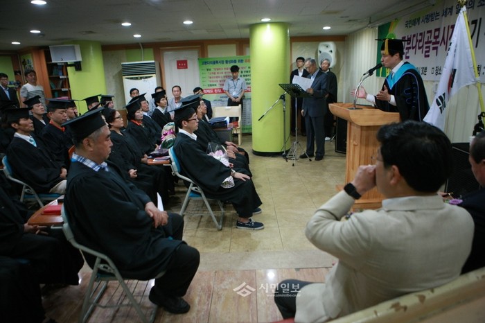 지난달 31일 서울 강동구 천호교회에서 개최된 ‘고분다리 전통시장 상인대학 졸업식’에 참석한 이해식 구청장(오른쪽)이 명예학장으로서 졸업생 34명에게 표창장(3명)과 졸업장을 수여하고 축사를 하고 있다.(사진제공=강동구청)