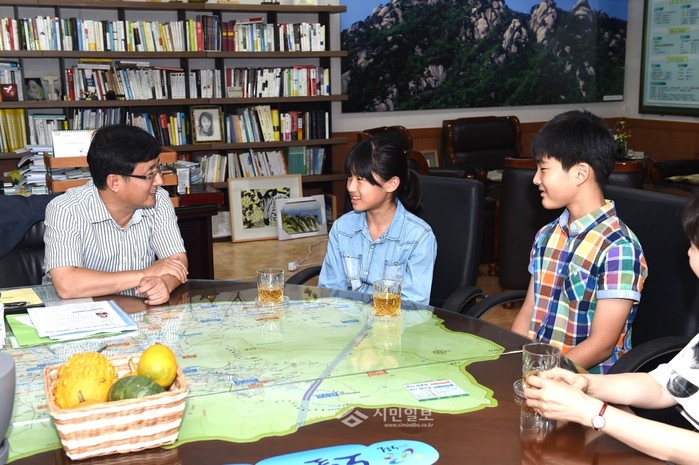 김성환 노원구청장(왼쪽)이 최근 구청 5층 집무실에서 ‘우리동네 오케스트라 노원’ 단원 중 예술영재로 선발된 민인경양과 최원호군을 만나 축하인사를 건네며 격려하고 있다.(사진제공=노원구청)