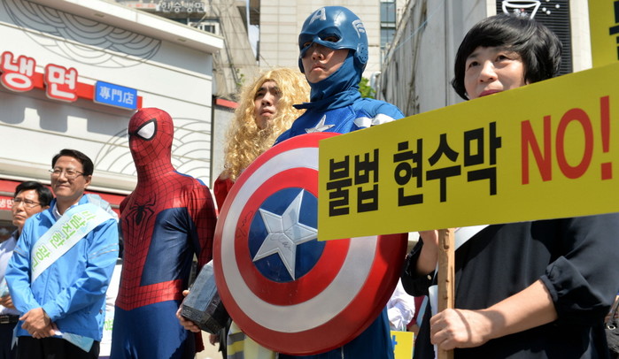 1일 오전 서울 서대문구 신촌 연세로 스타광장에서 열린 '불법현수막 근절, 바람직한 광고문화 정착' 캠페인에서 불법광고물 자율정비단이 발대식을 하고 있다. /뉴시스