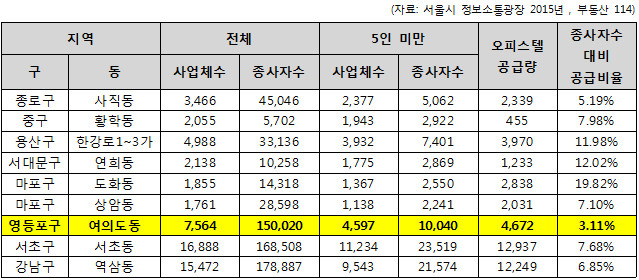 | ▲ 표1> 주요 지역 별 사업체 종사자수 대비 오피스텔 공급비율 | ||