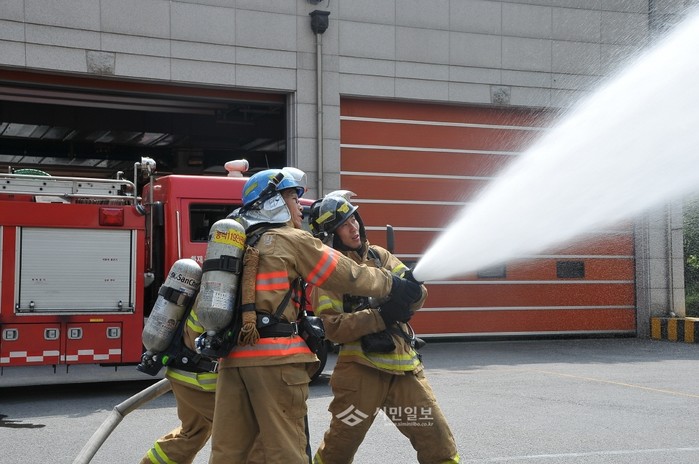 서울 동작소방서는 지난 1일 오후 2시 소방서 후정에서 '소방대원 화재현장 숙지훈련'을 실시했다. 사진은 소방서 관계자들이 방수훈련을 하고 있는 모습.(사진제공=동작소방서)