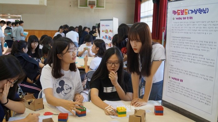 경북 구미여자고등학교는 최근 수학의 눈으로 세상을 바라보자는 취지 아래 '2015 교내 수학체험전'을 본교 강당에서 2학년 전교생을 대상으로 실시했다. 사진은 이날 체험전에 참여한 학생들이 카드 보드를 이용한 '가상공간 체험'을 진행 중인 모습.(사진제공=구미교육지원청)