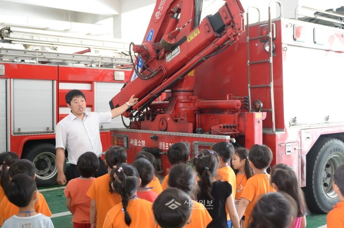 서울 영등포소방서는 3일 오전 소방서 4층 소방안전체험관에서 신이화어린이집 보육교사와 원아 20여명을 대상으로 소방안전체험교육을 실시했다. 사진은 이날 안전체험에 참여한 어린이들이 소방차 견학을 하고 있는 모습.(사진제공=영등포소방서)