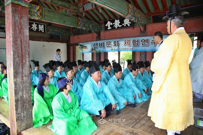 경북 구미시는 최근 공무원 36명을 대상으로 제3기 청렴문화 체험교육을 도산서원 선비문화수련원에서 실시했다. 사진은 이날 교육에 참여한 5급 이상 간부공무원과 업무담당자 36명이 참여해 선인들의 삶과 정신을 느끼는 청렴 교육을 받고 있는 모습.(사진제공=구미시청)